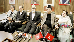 NC leaders addressing a press conference in Srinagar. -Excelsior/ Shakeel