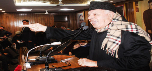 NC president Dr Farooq Abdullah addressing his party workers in Srinagar on second death anniversary of Sheikh Nazir Ahmad. -Excelsior/ Shakeel
