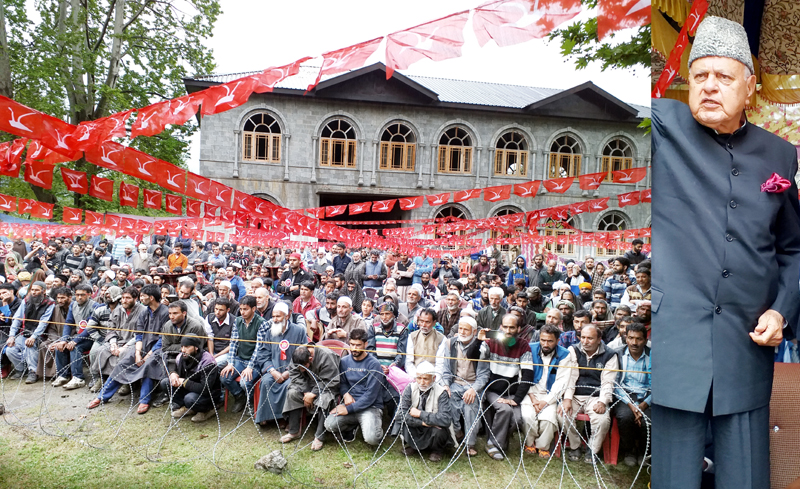 NC president Dr Farooq Abdullah addressing public rally at Devsar in Qazigund.-Excelsior/Sajad Dar