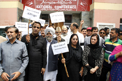 Srinagar, Aug 8: As curfew and shutdown enters second month in Kashmir, Opposition National Conference (NC) today protested here against the response of State Government to unrest and demanded an end to bloodshed and use of force including pellets against protesters.