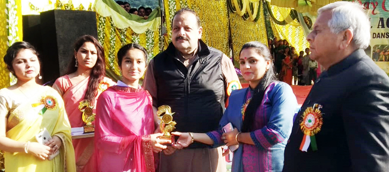 NC Provincial President Devinder Rana felicitating winners during Annual Day celebration at National Academy HS Jandrah in Jammu.