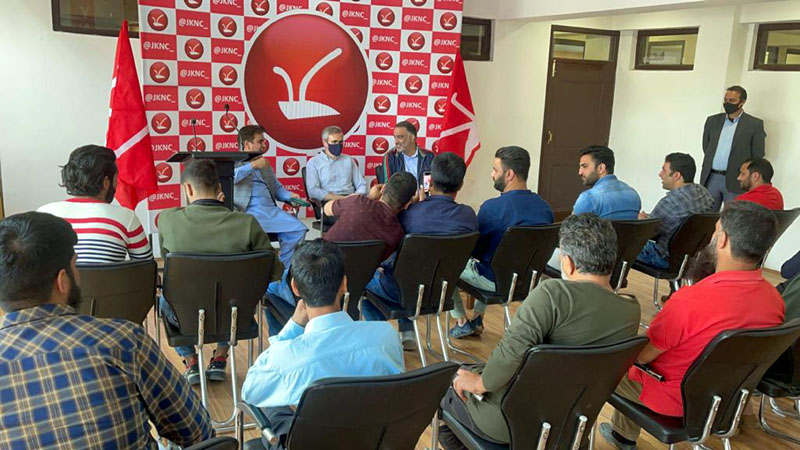 NC vice president, Omar Abdullah with Youth NC leaders during a meeting at Srinagar on Wednesday.