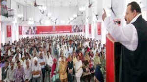 Provincial President National Conference Devender Singh Rana addressing day long convention of party workers at Sher-e-Kashmir Bhawan on Sunday.