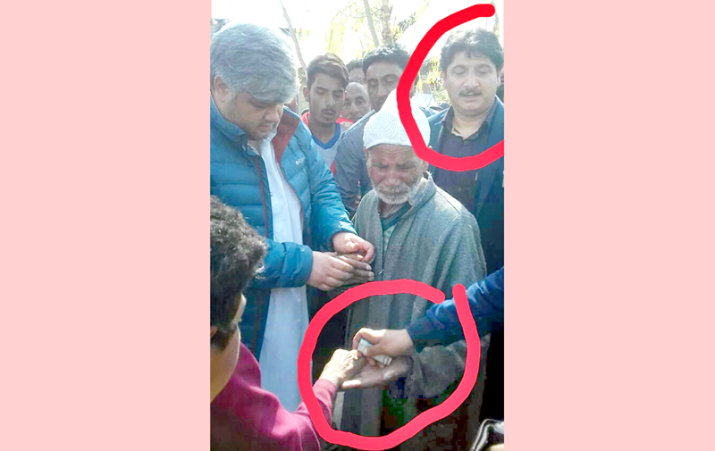 NC workers allegedly giving away money to people to lure voters in Sonawari Sumbal. Son of NC candidate Mohammad Akbar Lone (encircled) can be seen in the photograph.