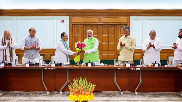 Senior BJP leaders met at the party’s national president J P Nadda’s residence in what was seen as part of the party’s exercise to reach out to allies over issues like their share of ministerial berths and pick the probables from within their party for the coalition government.