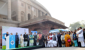 The PM inspected the retrofit electric bus, which is a conversion of a diesel bus into a battery-operated electric one, and handed over the key to the Speaker Mahajan.