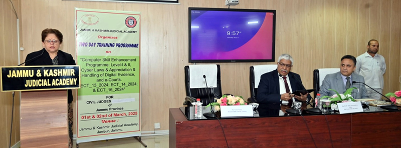 JAMMU, Mar 1: Under the patronage of Chief Justice, High Court of Jammu & Kashmir and Ladakh (Patron-in-Chief, J&K Judicial Academy), Tashi Rabstan, and guidance of Chairperson and members of Governing Committee for J&K Judicial Academy, a two day programme on “Computer Skill enhancement Programme- Level I & II, Cyber laws & Appreciation & Handling of Digital Evidence and e-Courts for Civil Judges of Jammu province commenced today at J&K Judicial Academy, Janipur.
