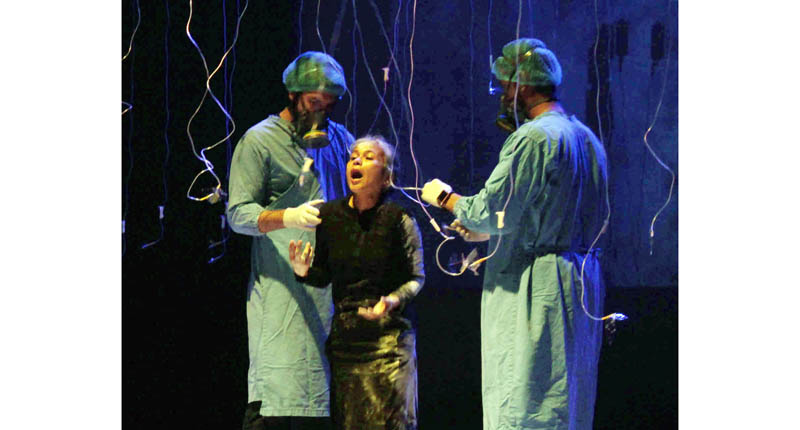 Directed by young Bimal Subedi, alumni of National School of Drama, and adapted from late Jagdish Ghimire’s novel ‘Sabiti, the play was structured as a monologue. The main actor Anuradha Majumdar, as protagonist started with sharing her feeling claustrophobic in life. Walking under the overhanging cluster of blood and glucose transfusion bottles with their dangling lines, the protagonist, speaking dialogues in English and Hindi, through her metaphorical description of the experience and substance of vomit, the almost mechanical process of birthing and raising progeny- alludes to the drift from the undefined idealistic assumptions to something quite conventional and middle class and boring.