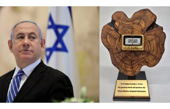Describing the golden pager, the newspaper said it showed text that read ‘Press with both hands,’ and was embedded on a wooden trophy-style display with a placard message saying: “To President Donald J Trump, our greatest friend and greatest ally. Prime Minister Benjamin Netanyahu.”