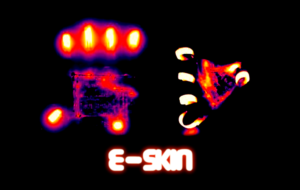 The e-skins are soft (same material for the target robot body), thin (less than 1 mm), and lightweight (about 0.8 g) and also feature the spatially fragmented circuit configuration with a slew of miniature integrated circuit (IC) components.