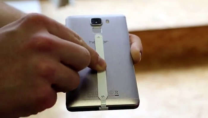 The sticker features two tiny metal dots (electrodes) along with a connector that is plugged into the charging port of the device.