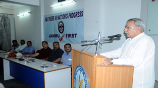 Newly appointed Administrator of Lakshadweep Islands, Farooq Khan addressing gathering during a function at Chamber House in Jammu on Saturday.