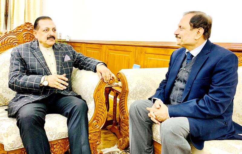 NEW DELHI, Jan 6: Newly appointed Advisor to the Union Territory Government of Jammu & Kashmir, Rajiv Rai Bhatnagar today paid a courtesy call to Union Minister of State (Independent Charge) Development of North Eastern Region (DoNER), MoS PMO, Personnel, Public Grievances, Pensions, Atomic Energy and Space, Dr Jitendra Singh, before he prepares to leave for the winter capital Jammu to take over his new assignment.
