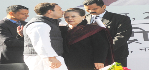 Newly elected Congress president Rahul Gandhi kissing his mother and outgoing party president Sonia Gandhi after her address to the partymen, in New Delhi on Saturday. (UNI)