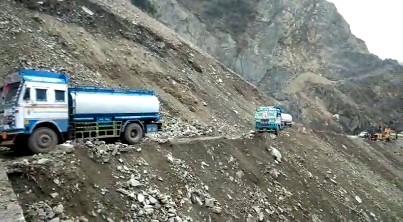 Oil tankers crossing Marog landslides zone and moving towards Kashmir on Tuesday. -Excelsior/Parvaiz
