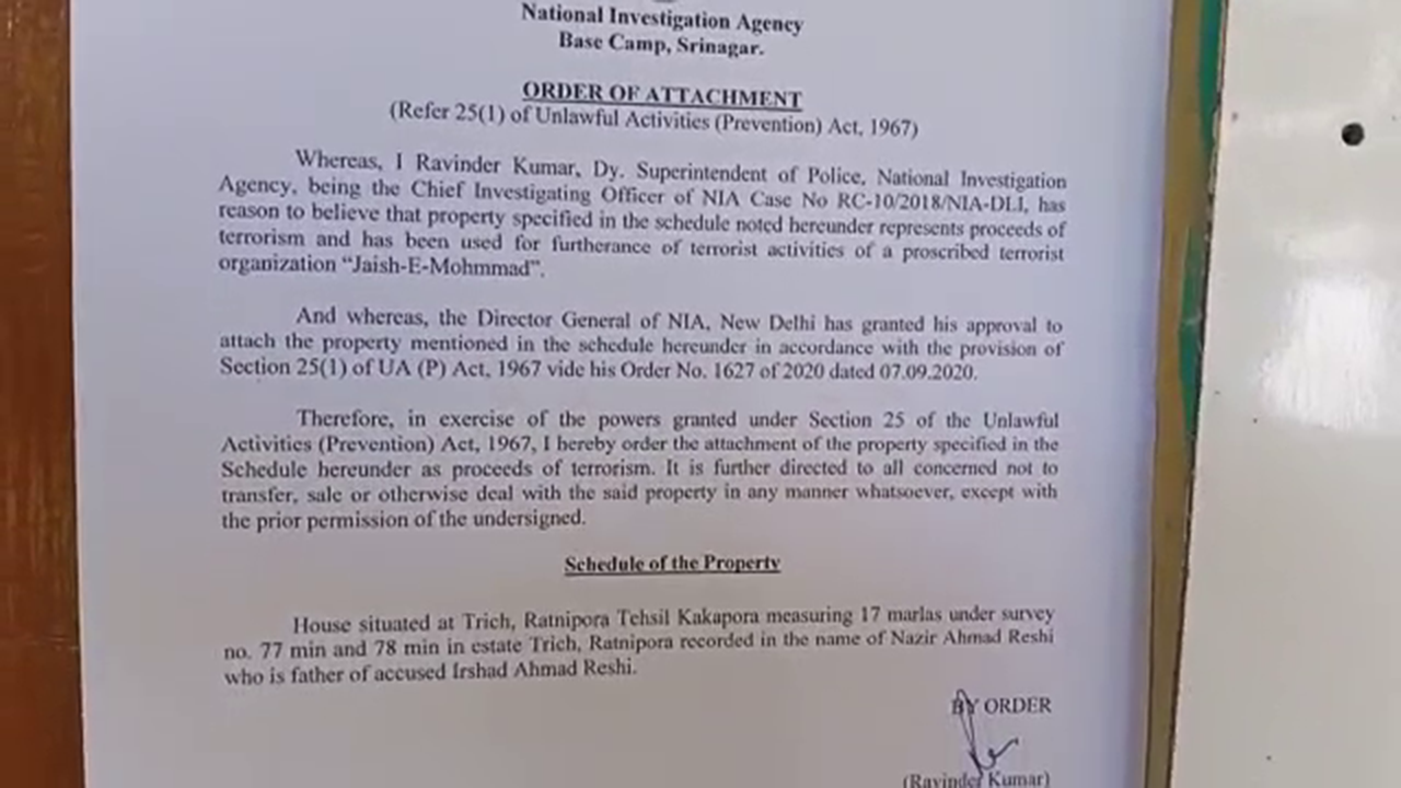 SRINAGAR: The National Investigation Agency (NIA) on Saturday ordered attaching of a property of Jaish-e-Mohammed (JeM) terrorist Irshad Ahmed Reshi, who was arrested by the agency in connection with an attack on a CRPF Group Centre in south Kashmir in 2017