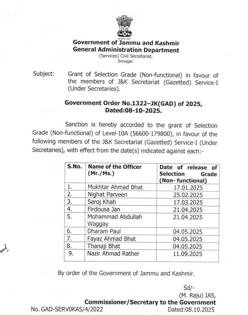 JAMMU, Oct 8: The Government of Jammu and Kashmir has accorded sanction for granting Selection Grade (Non-functional) of Level-10A (Rs 56,600–Rs 1,79,800) in favour of nine officers of the J&K Secretariat (Gazetted) Service-I (Under Secretaries).