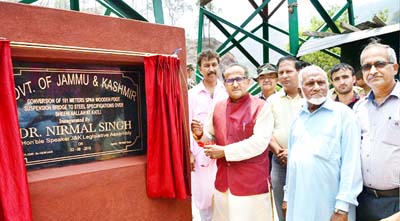 KATHUA, June 3: Speaker Legislative Assembly Dr. Nirmal Singh today dedicated 101 meter steel foot bridge constructed over Bheeni Nallah to the people at village Katli of Billawar.