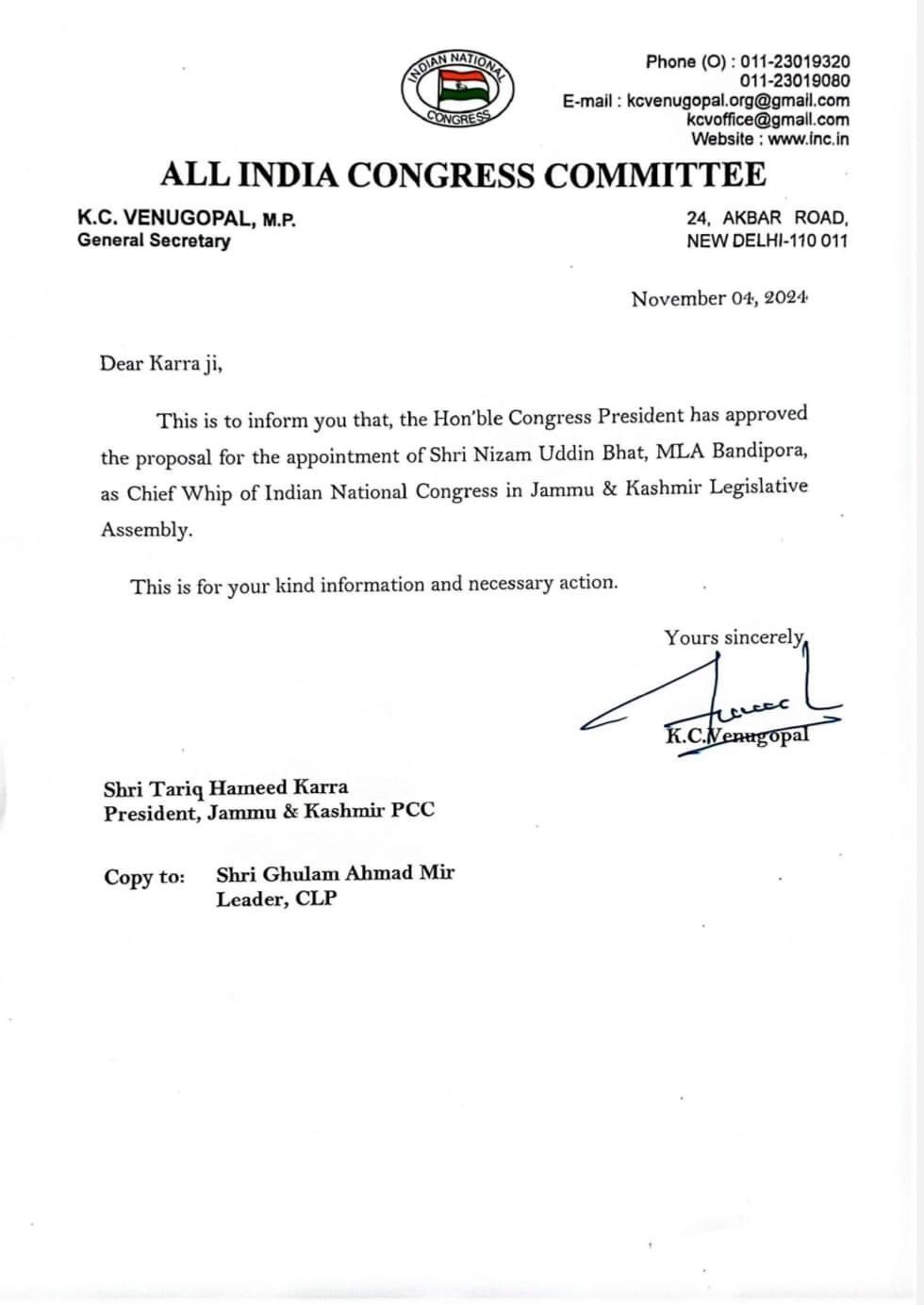 Nizamuddin Bhat Appointed Chief Whip Of Cong In J&K Legislative Assembly By Daily Excelsior - November 4, 2024 Share FacebookTwitterWhatsAppPinterestLinkedinCopy URLTelegramEmailTumblrReddItPrintKoo JAMMU, Nov 4: The All India Congress Committee (AICC) has appointed MLA Bandipora, Nizamuddin Bhat, as the Chief Whip of the Party in Jammu and Kashmir Legislative Assembly. Follow our WhatsApp channel