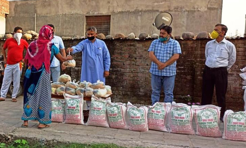 JAMMU, May 10: BJP Jammu West distributed dry ration amongst more than 100 needy families which also included migrant labourers who are residing in Ward 32 of Jammu West Assembly segment. Former State president, BJP and Ex MLA, Sat Sharma (CA) distributed ration amongst them. He was accompanied by district president, BJP, Munish Khajuria, Mandal president, Keshav Chopra, Corporator, Ward 32 Sat Pal Karlupia, district general secretary, Rajesh Gupta and others.