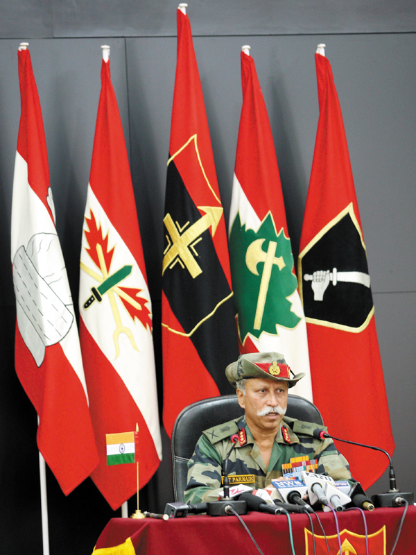 GOC-in-C Northern Command Lt Gen K T Parnaik addressing a press conference in Udhampur on Monday.
