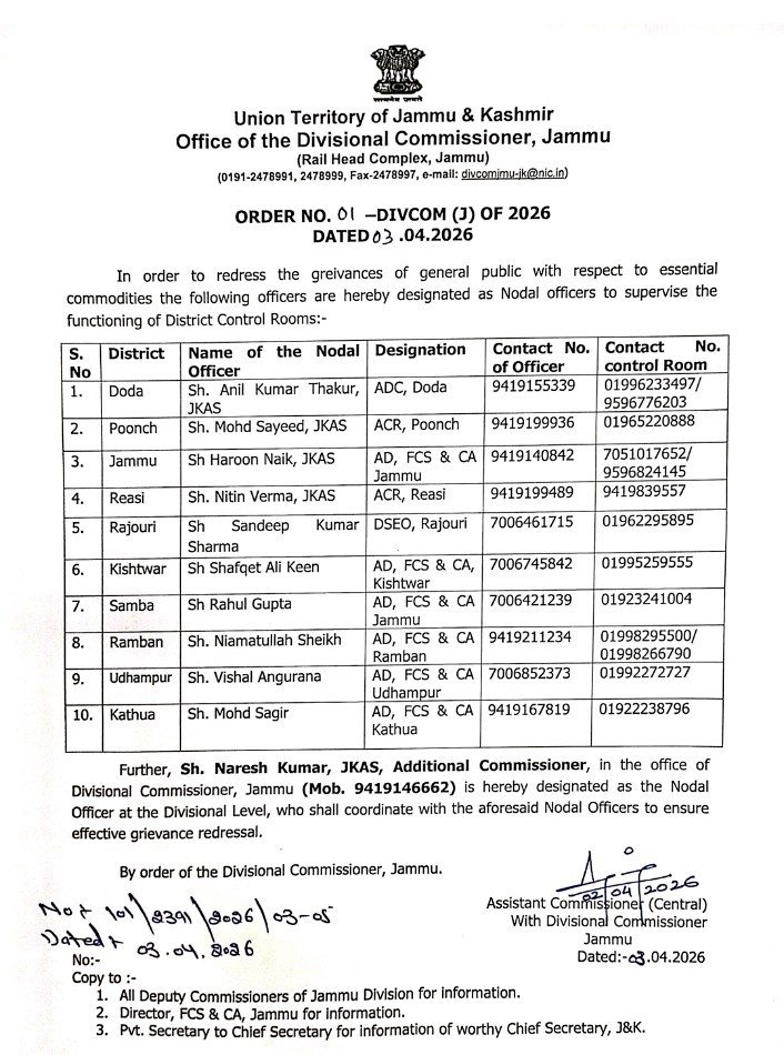 Nodal Officers Appointed To Monitor Essential Commodities In Jammu Division By Daily Excelsior - April 3, 2026 Share FacebookTwitterWhatsAppPinterestLinkedinCopy URLTelegramEmailTumblrReddItPrintKoo JAMMU, Apr 3: To address public grievances related to essential commodities, the Divisional Commissioner Jammu has designated nodal officers for all districts in the Jammu division to supervise the functioning of District Control Rooms. Follow our WhatsApp channel