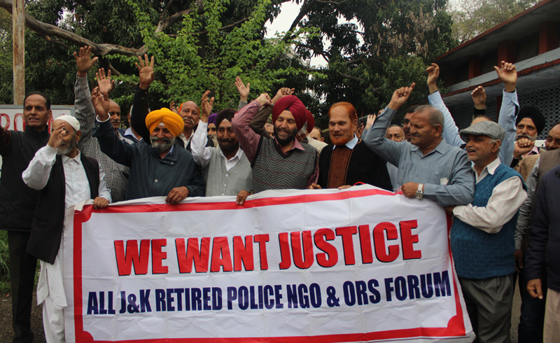 JAMMU, Mar 5: Non Gazetted Police Pensioners Welfare Forum today staged protest demonstration here at Press Club, to fulfil their long pending demands regarding pay anomalies and many others.