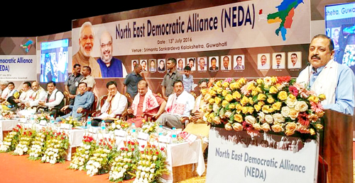 Union DoNER Minister Dr Jitendra Singh speaking about development projects in Northeast at the inaugural conclave of NEDA (North East Democratic Alliance), at Guwahati on Wednesday. Seated on the dias are BJP National President Amit Shah, Chief Ministers of four NEDA ruled States and other dignitaries.