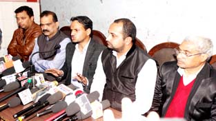 Nowshera JAC members- Bharat Bhushan, Ravikant and others addressing joint press conference at Jammu on Monday. -Excelsior/ Rakesh