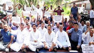 Seeking release of long pending wages and regularization of services of DRWs, need based workers and Casual labourers working in Tourism Development authorities (TDAs) the NPP workers held protest at Exhibition Ground Jammu on Monday.