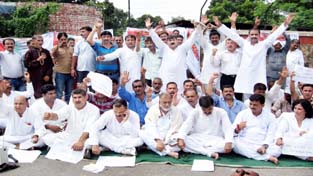 NPP workers staging protest outside Raj Bhavan in Jammu on Wednesday.       -Excelsior/Rakesh