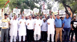 JAMMU, Oct 10: Strongly condemning the brutal assault on Dalits besides other marginalized sections of the society in the country and the State in particular, NPP activists spearheaded by Harshdev Singh chairman of the party and Balwant Singh Mankotia State president, staged a demonstration seeking arrest and stringent action against the culprits for perpetuating atrocities on the said community, at Exhibition Ground here today.