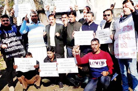 JAMMU, Jan 20: Accusing the BJP Govt of criminal silence post re-organization over the issues of Delimitation and Assembly elections in the State, NPP activists led by party chairman Harshdev Singh held a massive protest demonstration at exhibition ground Jammu today.