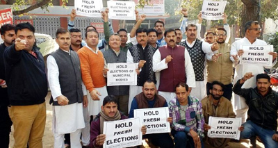 JAMMU, Nov 21: Condemning the State Govt for its policy of delay and deny over elections to Urban Local Bodies, a large number of J&K National Panthers Party activists led by party chairman Harsh Dev Singh staged a protest demonstration at Exhibition Ground here today.