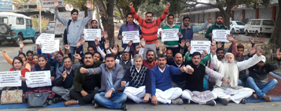 JAMMU, Dec 4: Castigating the State Government for its criminal apathy towards School, College and Polytechnic lecturers engaged on Academic arrangements, the Panther Party activists along with scores of such lecturers spearheaded by Rajesh Padgotra, Provincial president NPP and Gagan Pratap Singh general secretary Young Panthers and others, staged a protest demonstration seeking immediate salary enhancement and regularization of their services at Exhibition Ground here today.