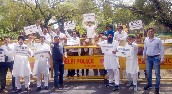 NEW DELHI, Mar 15: Describing the growing influx of Rohingyas and Bangladeshis in Jammu as a deep rooted conspiracy to change the demographic profile of the region, activists of JKNPP led by party Chairman, Harsh Dev Singh and State president Young Panthers Yashpal Kundal, staged a protest demonstration outside the Parliament, here today.