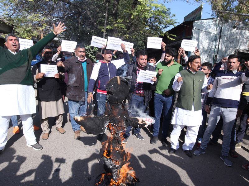 JAMMU, Dec 8: Seeking immediate publication of Delimitation report besides equal number of Assembly seats for Jammu and Kashmir regions, a strong contingent of Panthers Party activists led by its chairman Harsh Dev Singh held a protest demonstration in Jammu today and torched the effigy of BJP Govt and Delimitation Commission.