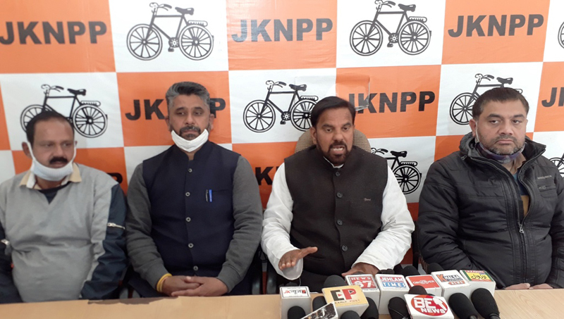 JKNPP chairman Harshdev Singh addressing a press conference at Jammu.