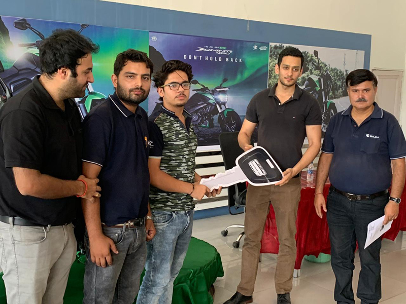 Officials of NSF Bajaj Satwari and Bajaj Auto Limited handing over keys of ‘Dominar 400’ bike to its owner at Jammu on Wednesday.
