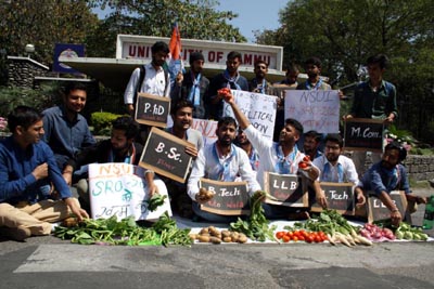 JAMMU, Mar 29: To register their protest against the PDP-BJP Government over the issue of controversial SRO-202, NSUI activists today played roadside vendors and put vegetable stalls in front of Jammu University main gate.