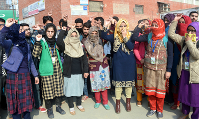 Scores of students who were pursuing Bachelor’s in Nursing from a University-affiliated college here in Srinagar staged a protest against the delay in declaration of their first-year results. The protesters assembled Press Enclave Srinagar and demanded an immediate release of their results.