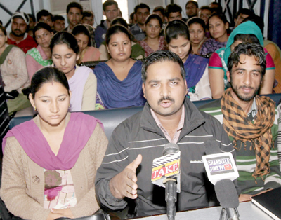 Excelsior Correspondent JAMMU, Nov 24: National Youth Corps (NYC) Association flayed the Government for not conceding their long pending demands, compelling them to adopt the path of agitation. Addressing a press conference, Asif Ali Bhat, State vice president, NYC, said that the Government is not paying any heed towards their demands, compelling them to adopt agitational path. He said 8000 NYCs are engaged with different Government Departments and have rendered 2 years service and now the Government is implementing use and throw policy, which is not bearable at all. Bhat further stated that the criminal silence of the Government on this issue will surely put the future of the 8000 NYCs in dark. He demanded regularization of their services under perfect policy, enhancement in honorarium and continuation of their service in the same departments they were serving in. Bhat said that if the Government failed to concede their demands, then the NYC volunteers will sit on hunger strike at New Delhi, till their demands were redressed. Among others present were Jagdeep Singh, Mushtaq Ahmed, Deepika Gour, Mohinder Singh, etc.