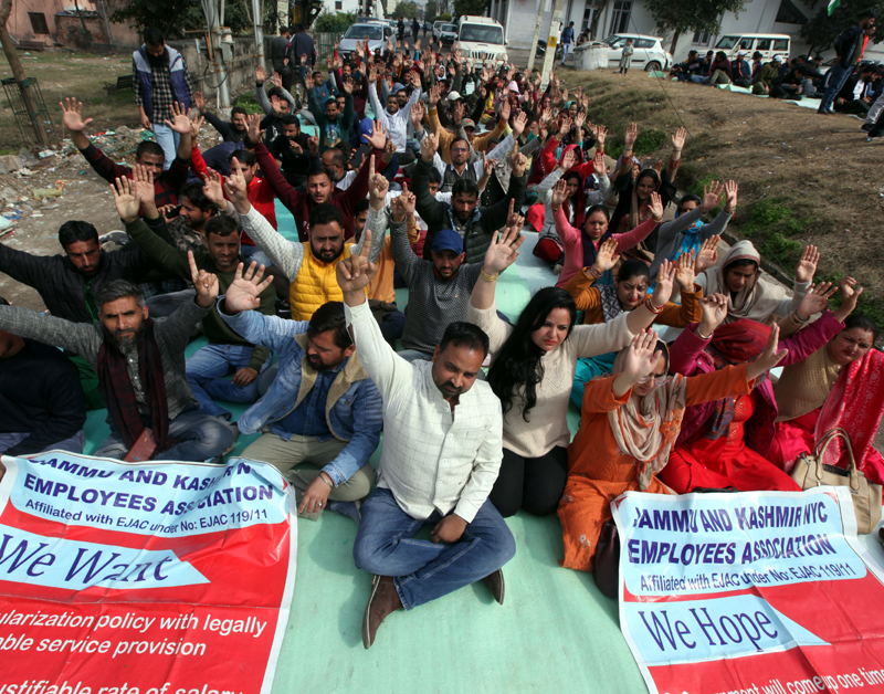 JAMMU, Feb 3: National Youth Corps (NYC) Association continued their protest outside BJP Headquarter Trikuta Nagar, demanding regularization of their services as well as salary enhancement, here today.