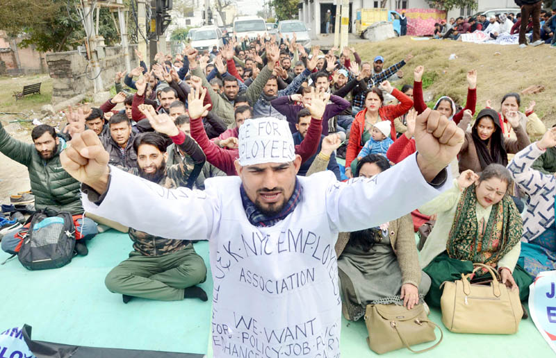 JAMMU, Jan 29: National Youth Corps (NYC) Association continued their protest demonstration in Jammu demanding immediate regularization of their services and enhancement of their wages.