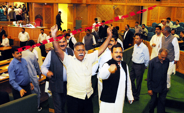 October – 08,2013- SRINAGAR :National Panthers Party and Bhartiya Janata Party members walking out from Jammu and Kashmir Legislative Assembly after the House witnessed noisy scenes over selective sanctions of Public Heath Centres in Health Department in the state , in Srinagar on Tuesday. Photo/ Mohd Amin War