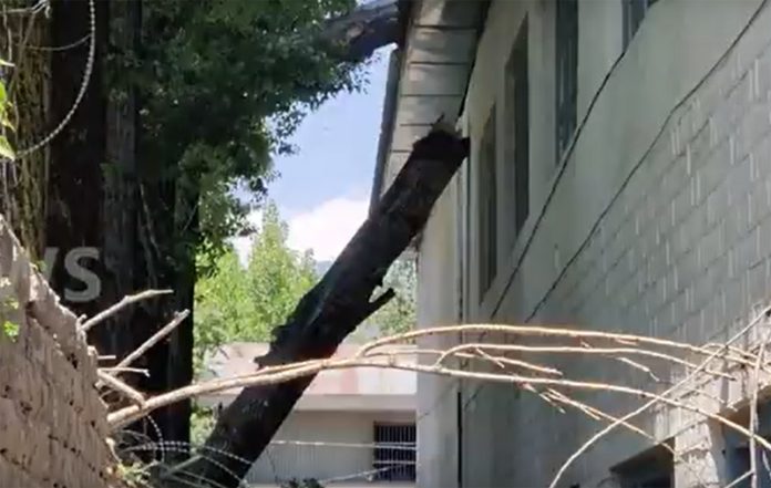 According to school authorities, strong winds swept through the area late last night, causing several branches from these trees to crash onto the school premises, resulting in damage.