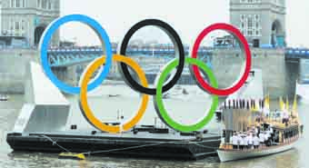 Olympic torch bearer Amber Charles holds the Olympic flame on a floating pontoon in front of Tower Bridge in London on Friday.(UNI)