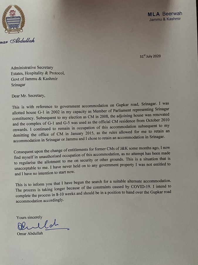 In a Letter to J&K Administration , Omar Abdullah notifies that he will be vacating his government accommodation in Srinagar before the end of October.