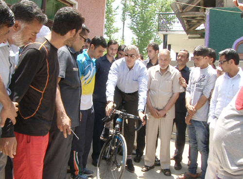 SRINAGAR, June 13: National Conference (NC) Working President and MLA Beerwah Omar Abdullah presented Merida Reacto 5000 bicycle worth Rs 2.8 lakhs to first State, National and International level cyclist Akbar Khan.