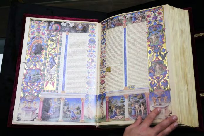 The bible was created between 1455 and 1461 by calligrapher Pietro Paolo Marone and illustrators Taddeo Crivelli and Franco dei Russi. The Italian Culture Ministry considers it one of the highest expressions of miniature art, “that unites sacred value, historic relevance, precious materials and refined aesthetics.”